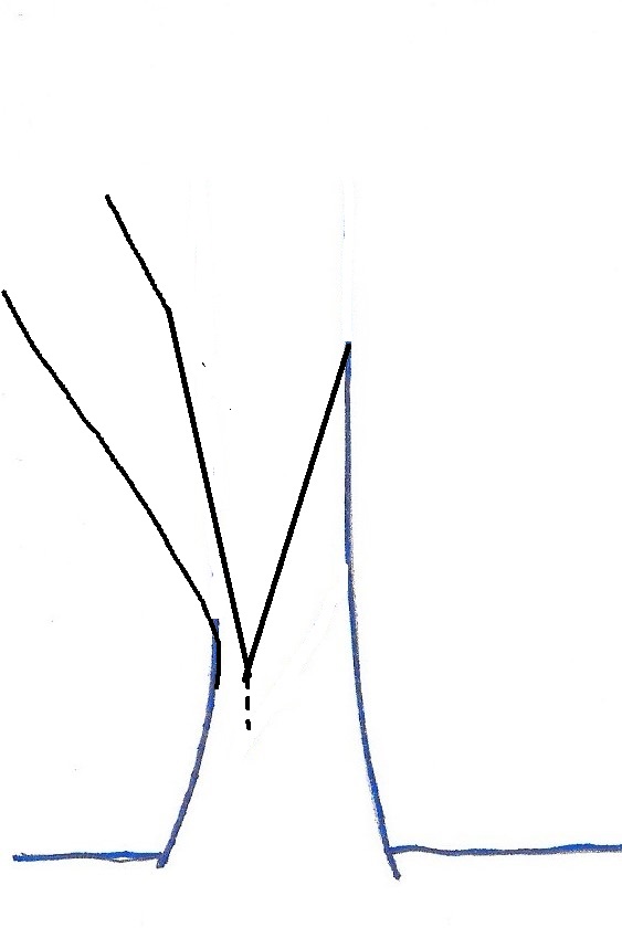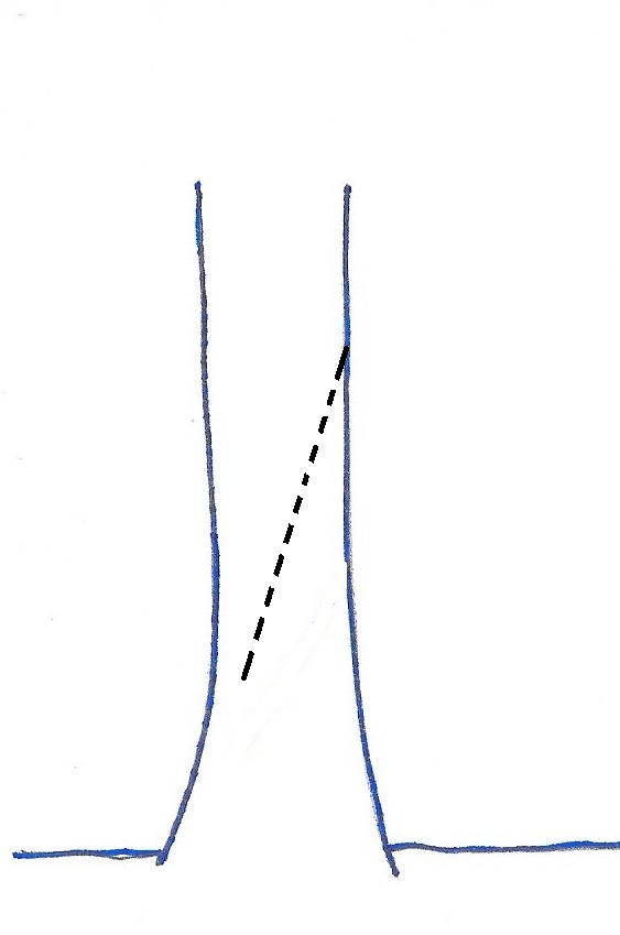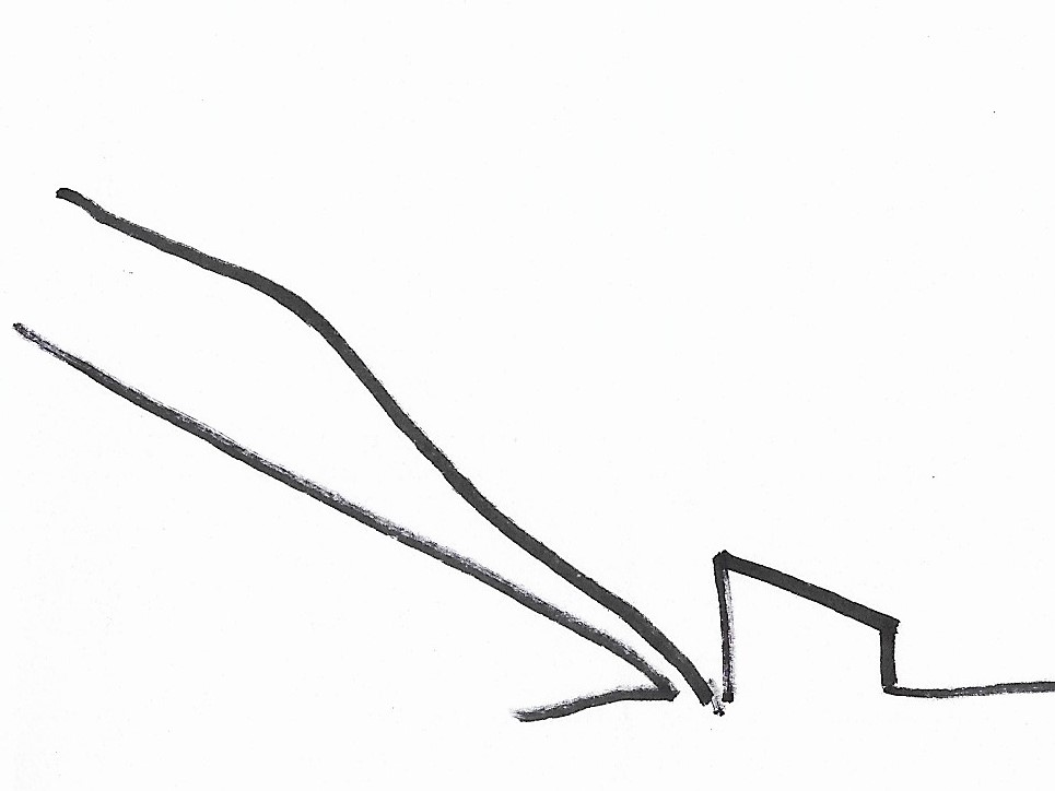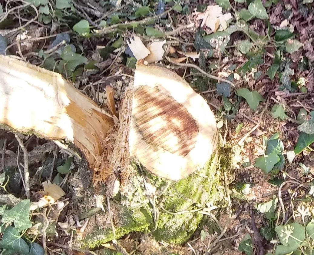 ![]() | Ensure that the stem is free from tangles before you begin. Using a billhook, a downward diagonal cut should be made low down on the right side of the stem. Ideally the cut should start at a height of about 4 or 5 times the diameter of the stem and aim to cut about 80% of the way through. The cut should be angled at about 30 degrees to the vertical or steeper depending on the thickness of the stem. You are aiming to deepen a single cut rather than creating several cuts in slightly different places: accuracy with the billhook is needed here, which will improve with practice! Avoid 'pecking' at the stem: be decisive! For thicker stems an axe can be used or a saw. Avoid twisting the billhook to try to create a downward split before it is ready. Support the upper part of the stem with your left hand and you will feel the tension in it change as you reach a critical point... |