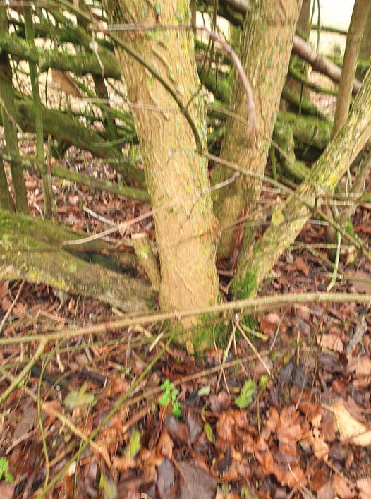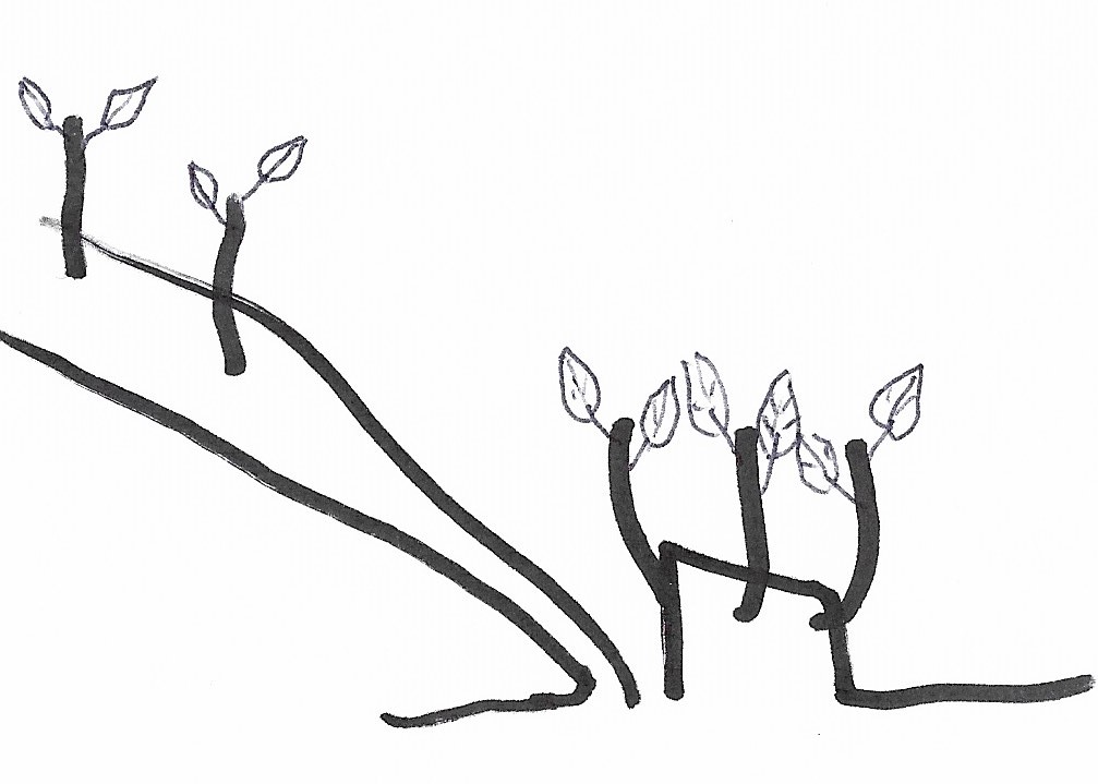 ![]() | In the spring new growth should appear from both the pleacher and the heel. The majority of the strength of the roots will be directed towards the heel rather than the strap feeding the pleacher: this is important because we are hoping for strong regrowth from the base of the hedge. After several years of growth, the hedge can be re-laid. At that stage ideally the old pleachers can be removed and the growth from the heels provide the new stems for laying. |