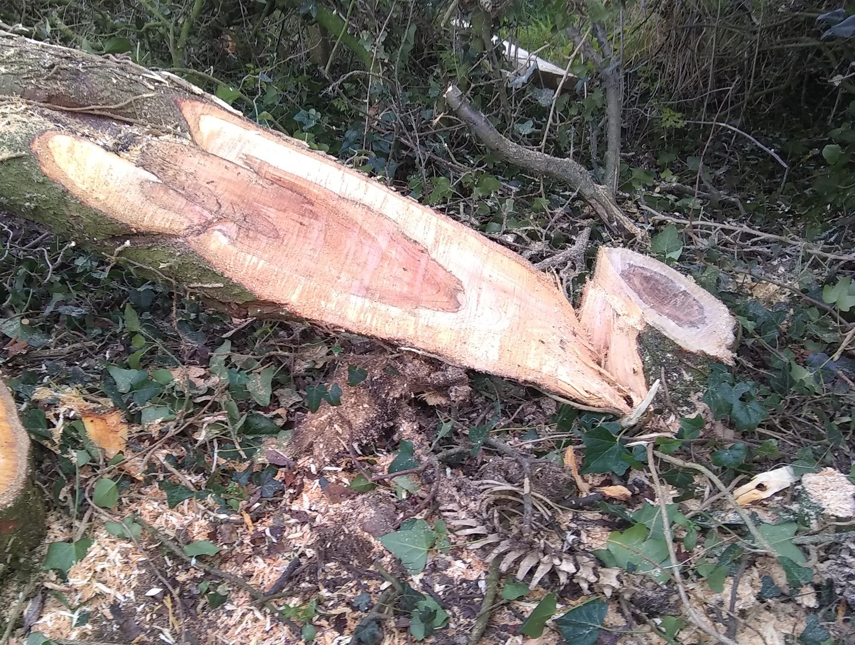 ![]() | ...until the stem splits, usually upwards and downwards. Cutting like this displays a poor understanding of the basic idea of hedgelaying. Unfortunately, this type of work is often seen amongst poorly trained workers who may themselves have been trained by poorly qualified instructors, or may simply have forgotten what they were shown. To repeat, avoid this type of cutting! |
